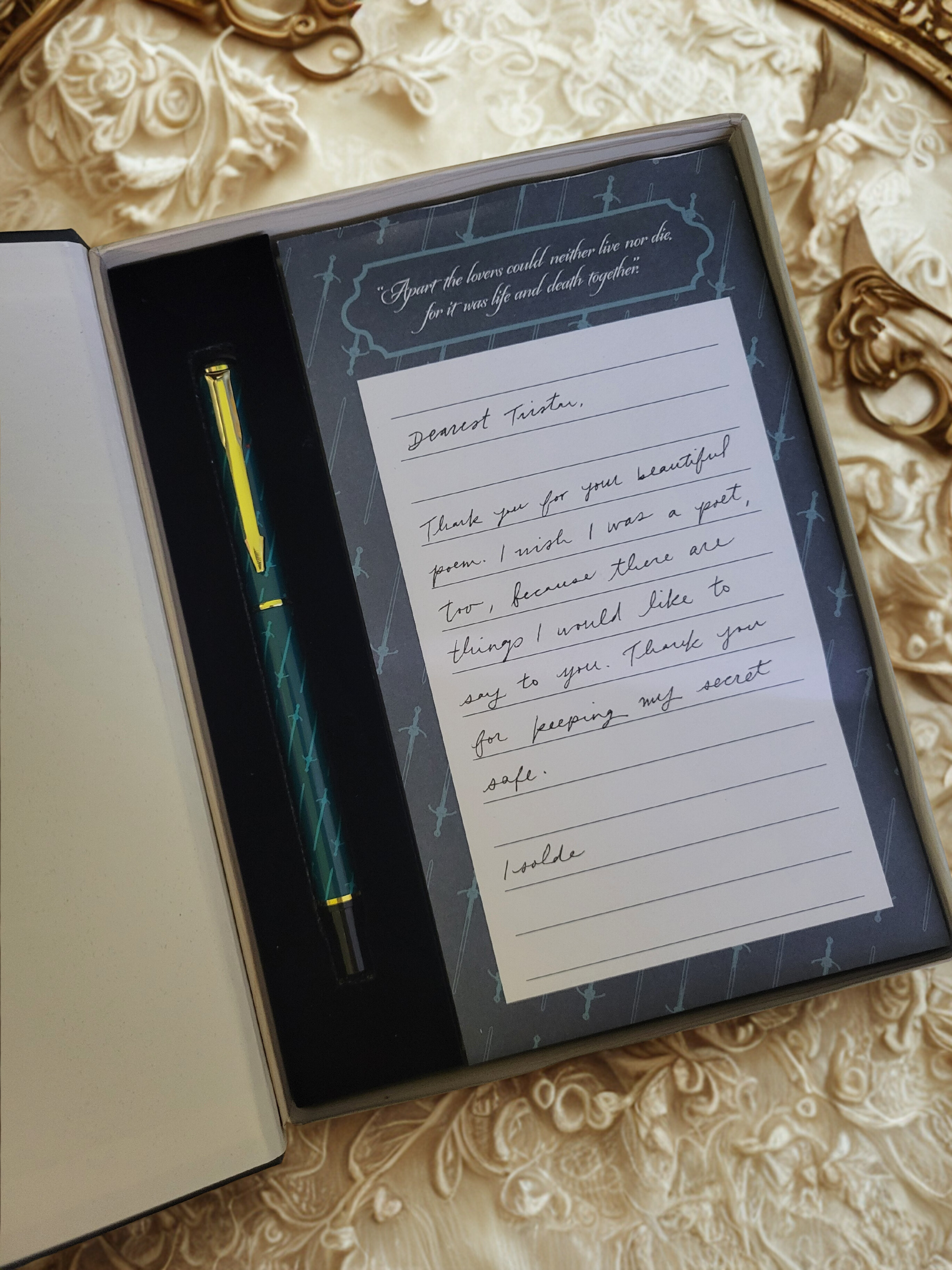 As for the gifts that came with this box, they were pretty decent. There was a pretty cool tube of red lipstick that has a “secret” way to open it, which is cool. There’s a very nice-smelling reed diffuser, a nice notepad with a matching pen, and a replica of the famous bracelets that you will hear about all throughout the book. The ones in the book had more diamonds on them, though! haha As for the book, it was a special edition hardcover. I tried to find a nice representation of the book, but wasn’t able to find any. It also has very pretty spayed edges, which I’m a sucker for. So the book design gets a 5 ⭐ from me! 🙂